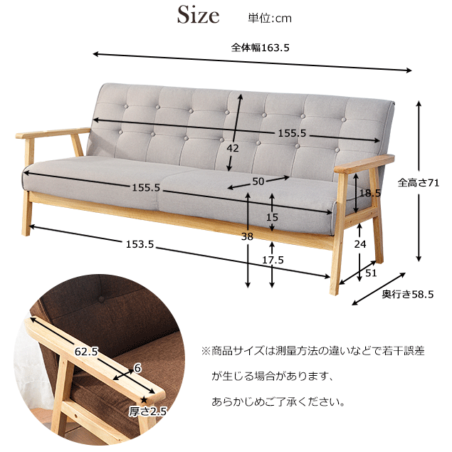 商品仕様 材質 フレーム:天然木本体:ファブリック/PVC+ウレタンフォーム 商品サイズ 約高さ71×奥行き51×155.5cm 梱包サイズ 約高さ37×奥行き55cm×幅155.5cm 商品説明 ・自然の質感が溢れる優しい手触りの天然木・怪我を防ぐ為に、全ての脚を角丸に加工する・おしゃれなファブリックと贅沢なレザータイプ・背姿も綺麗な同カラーで統一・クッションは硬すぎず、柔らかすぎない丁度良い座り心地・脚にキズ防止用のフェルトが付く 重量 約19kg 耐荷重 約200kg カラー グレーン/ベージュ/ネービー/ブラウン 商品番号 wf187228 生産国 中国 出荷形態 お客様組み立て式 備考 ※脚部を取り付ける時、本体を上下逆さになるとより簡単に組み立てることができます。