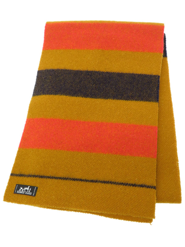 【神戸の質屋】【エルメス/HERMES】ロカバール マフラー ウール100% パイユ(マスタードイエロー×オレンジ×ネイビー)【美品】【送料無料】B0505y