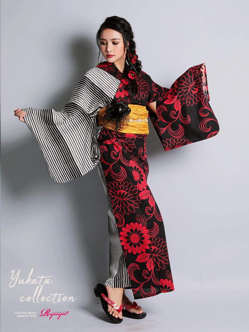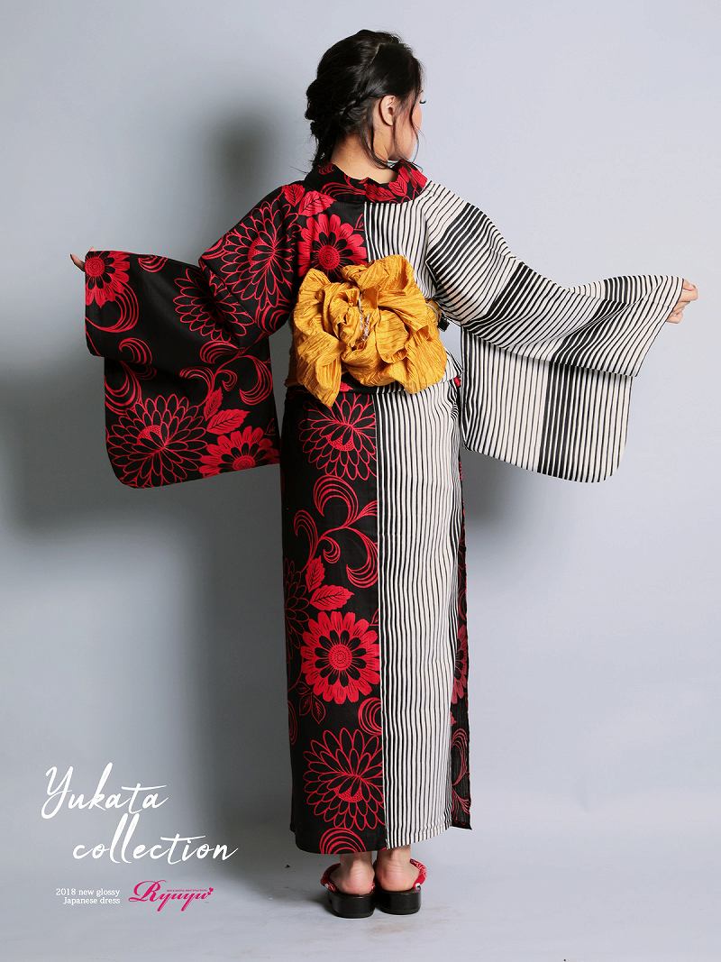 ストライプ柄と赤のモダン花柄がかっこいい仕上がりのレディース浴衣は今年トレンドの半身柄デザインでクールな印象を与えてくれるキャバ浴衣セット。