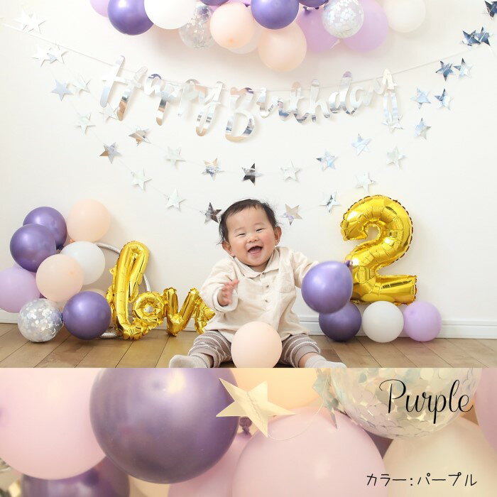 カラー:パープルのセット内容 ◇44点セット◇ ・Happy Birthdayガーランド(シルバー)×1 ・スターガーランド(シルバー)×1 ・5インチバルーン×24(マカロンパープル、マカロンオレンジ、マカロンホワイト、メタリックパープル×各6) ・5インチコンフェッティバルーン(シルバー)×2 ・ガーランドテープ×1 ・空気入れ×1 ・フープ(シルバー)×1 ・フープ用5インチバルーン×9 (マカロンパープル、マカロンオレンジ、マカロンホワイト、メタリックパープル、コンフェッティシルバーを組合せてお届け) ・loveバルーン(ゴールド)×1 ・数字「1」「2」「3」バルーン(ゴールド)×各1 ★